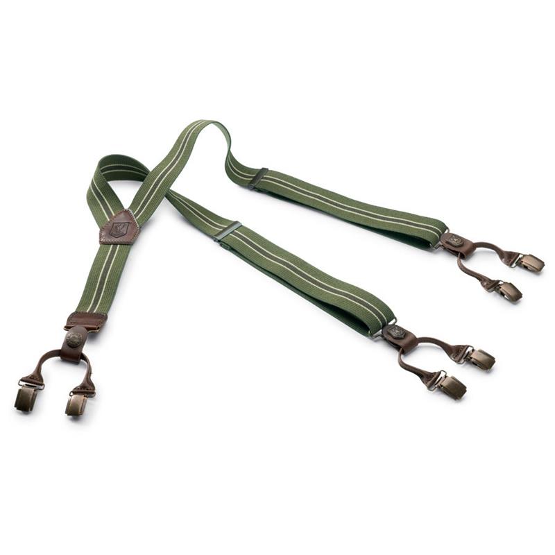 Alças para calças em elásticos e fixações em couro. Possibilidade de mudar as fixações de mola para fixações de botão (vendidos separadamente) graças a um sistema simples de botão de pressão.